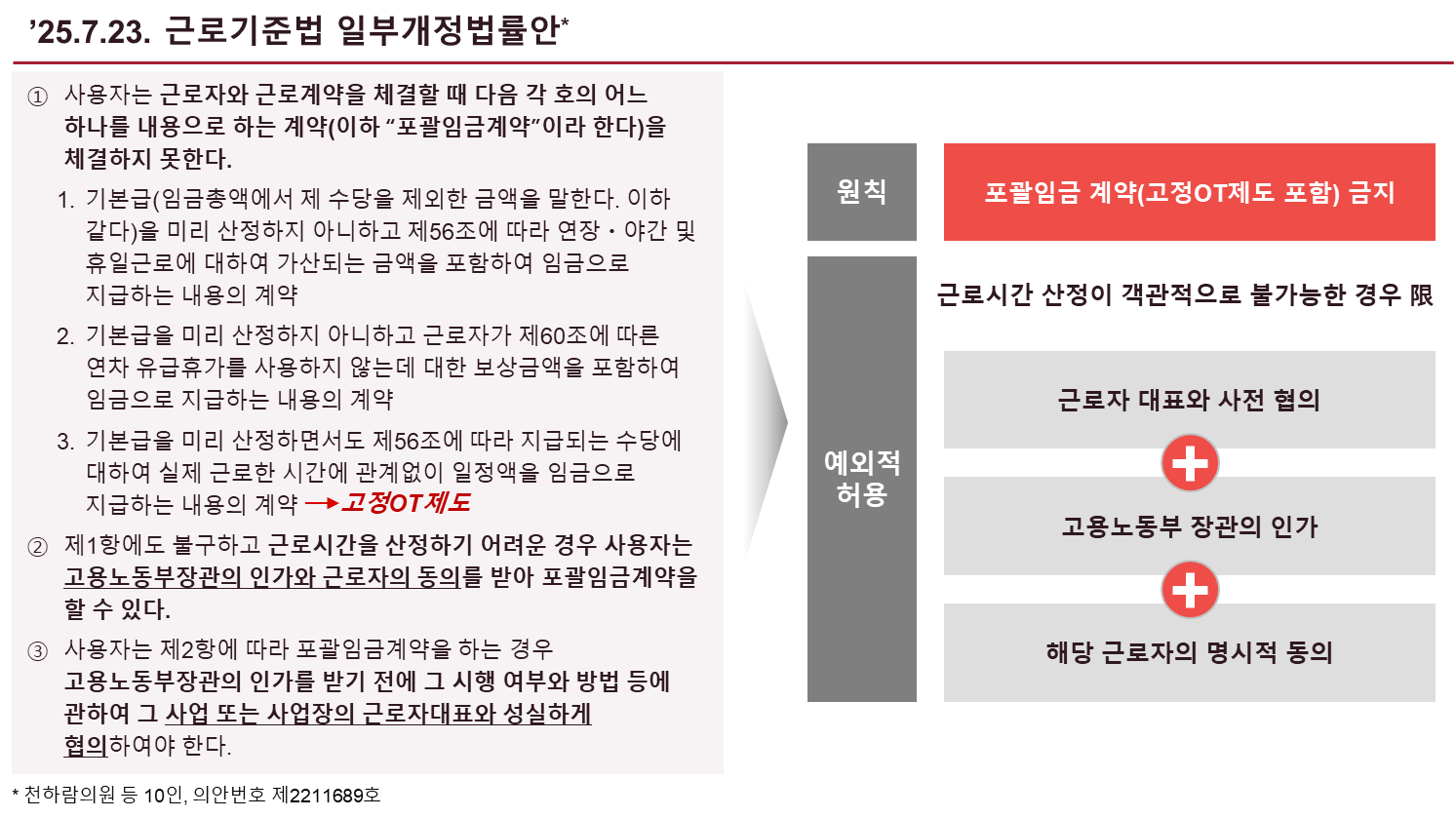 동 법안이 통과되면 고정OT제도를 포함한 포괄임금 계약 자체가 금지
