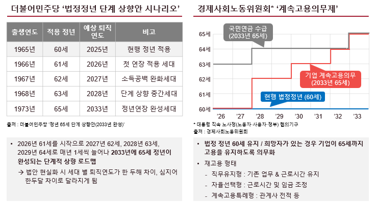 더불어민주당은 2033년까지 단계적으로 법정 정년을 65세로 높이는 방안을 추진 중이나,