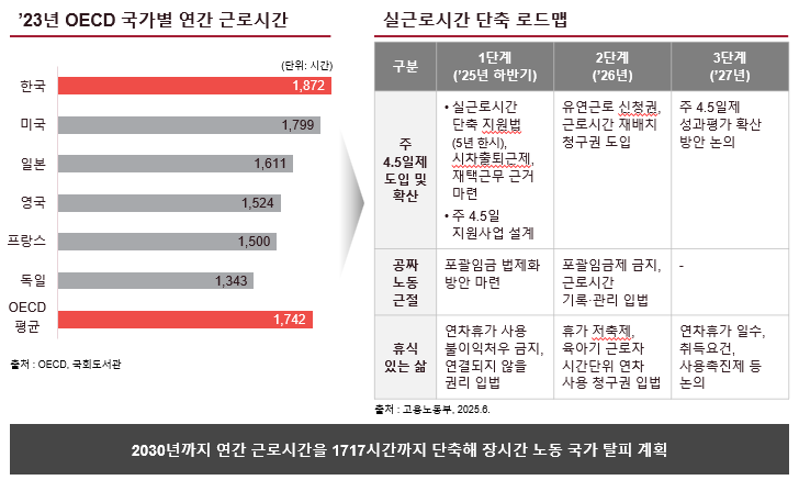 現 정부는 2030년까지 OECD 평균 이하 근로시간 달성을 목적으로, 임금 삭감 없이 실근로시간을 단축할 수 있도록 로드맵을 마련 중에 있으며,