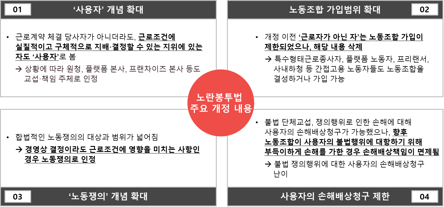 노란봉투법은 ① 법 상 ‘사용자’ 개념 확대 ② 노동조합 결격요건 축소 ③ ‘노동쟁의’ 개념 확대, ④ 사용자의 손해배상청구를 제한하는 내용을 담고 있습니다.